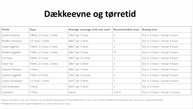 Tabellen herunder guider dig til den maksimale dækning for alle Farrow & Balls typer af glans. Malingens dækning afhænger af lagenes tykkelse og hvilken type overflade der males på.