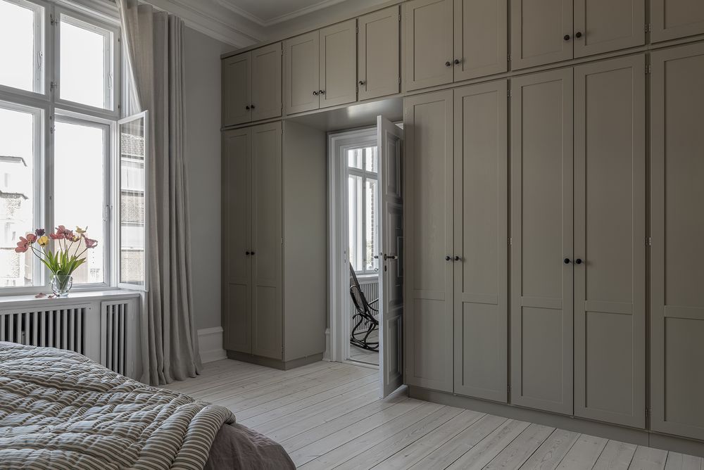 Et skab fra gulv til loft udnytter rummets helhed og skaber ro i rummet. Vi lod os inspirere af klassicismen og skabte en traditionel stil med et moderne udtryk, som var både enkel og tidløs.