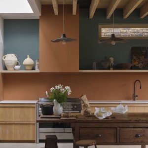 Fox Red is an earthy terracotta red with brown undertones. It’s less bright than Red Earth, a more yellow-toned terracotta from Farrow & Ball’s main palette, giving a complex feel. Try it with neutral Oxford Stone and soft green Treron for a warm and welcoming scheme.
