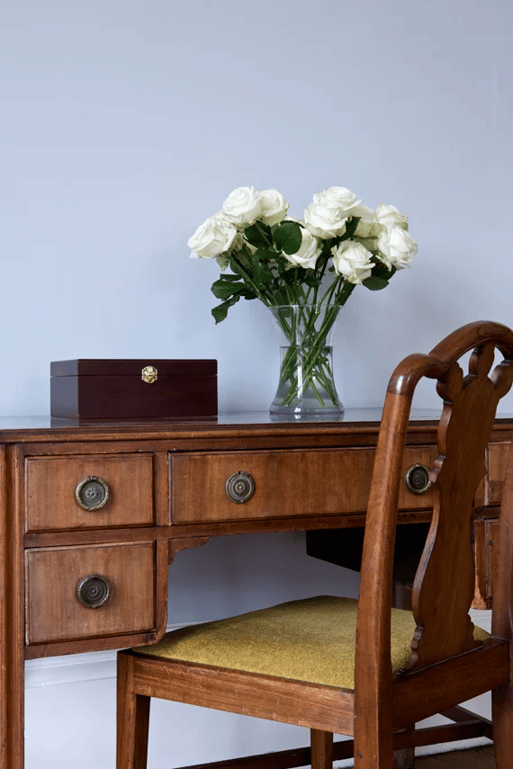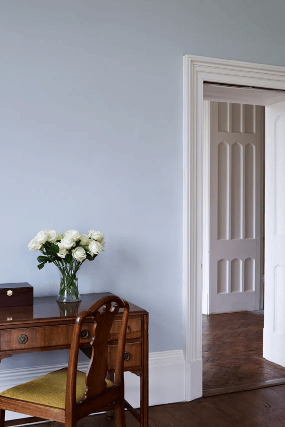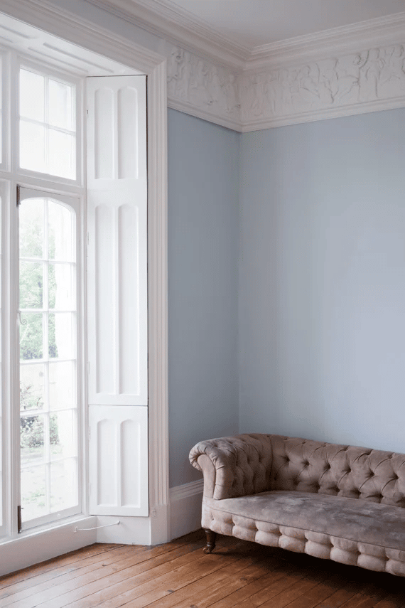 This pale blue grey takes its name from the soft natural light that often pours through ceiling skylights. However, it is less reflective than Borrowed Light, reading as a definite cool blue when used in small spaces but becoming paler and greyer when used in larger areas.